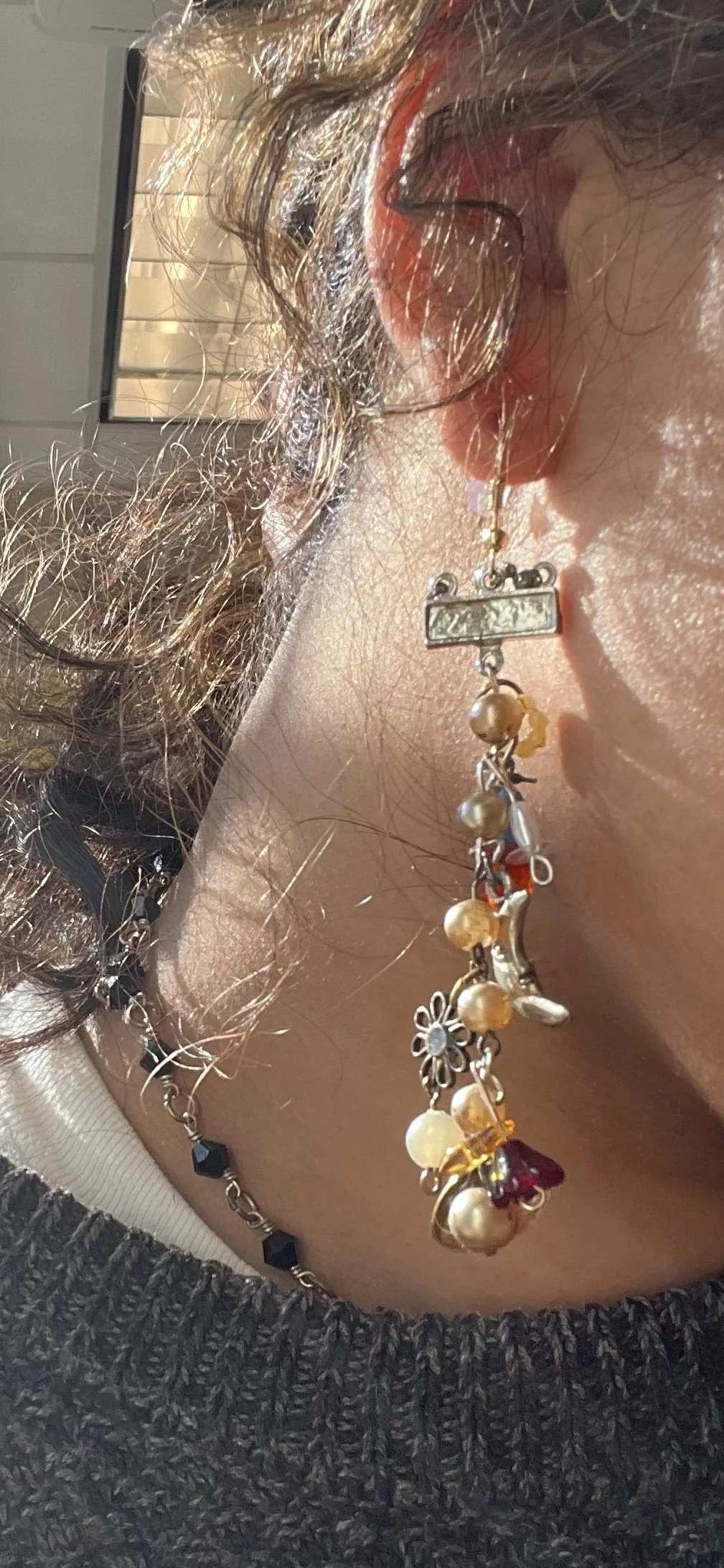 I created junk charm earrings with items I found around the costume shop. My inspiration was a charm bracelet, but in earring form. For these I used bead bases, used jump rings to attach more charms to them, and even created my own eye hooks.